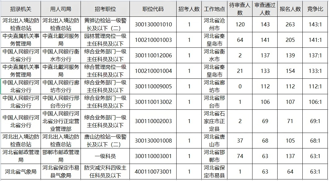 国考河北地区报名前十的岗位