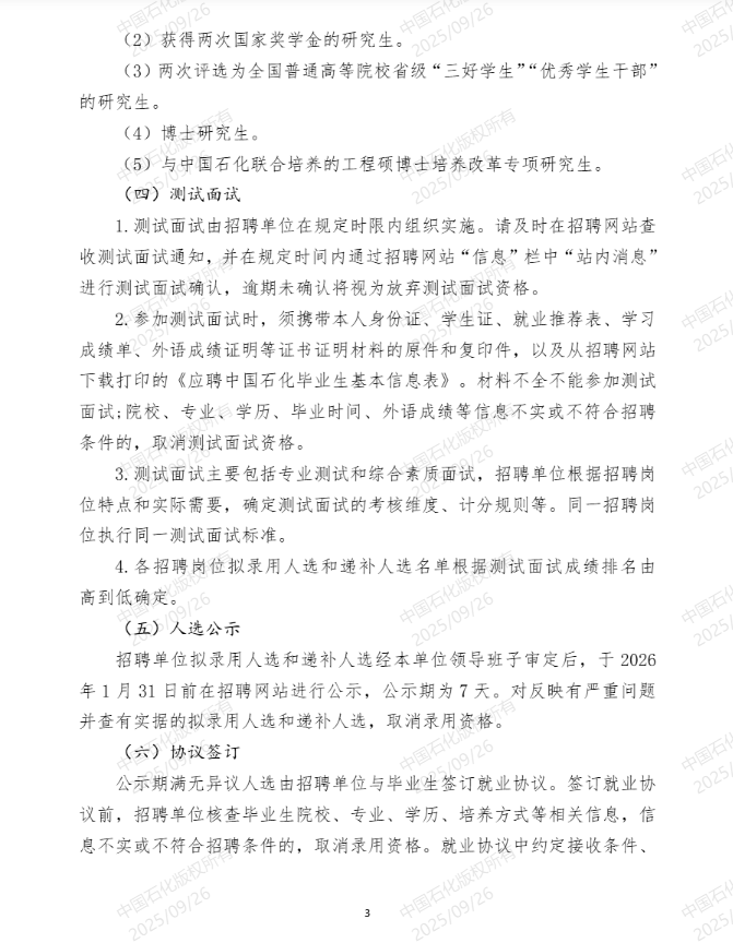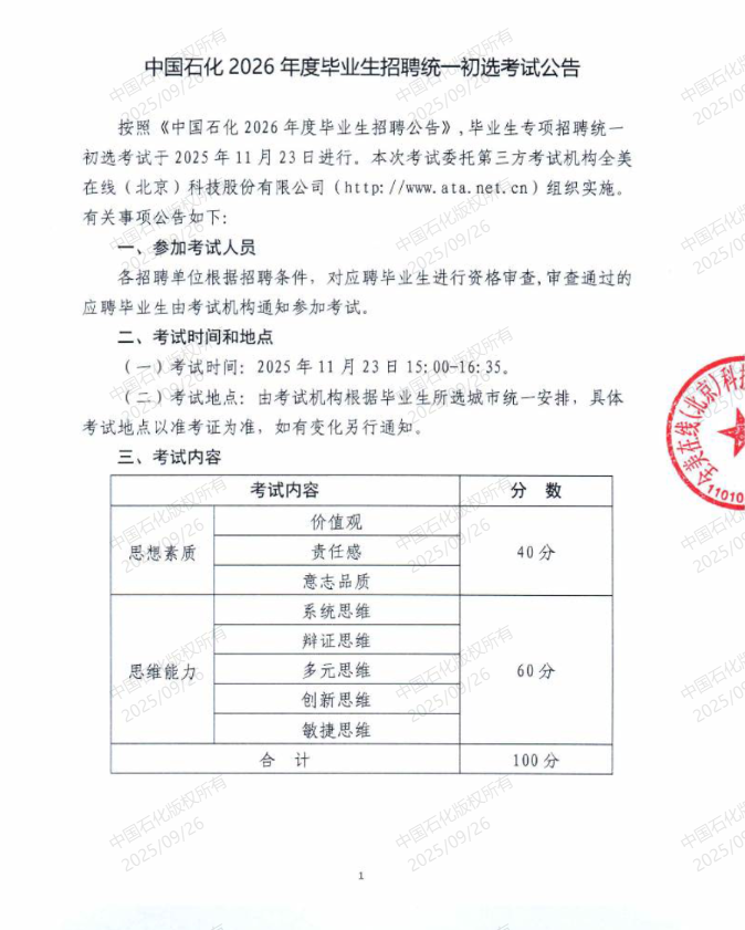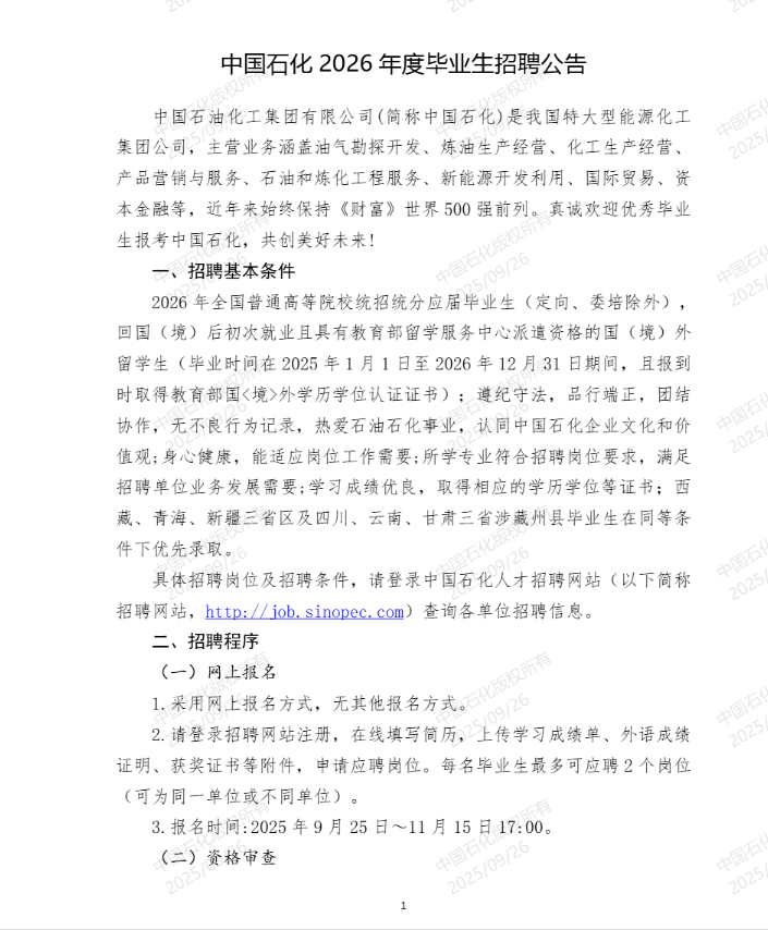 中国石化2026年度毕业生招聘统一初选考试公告