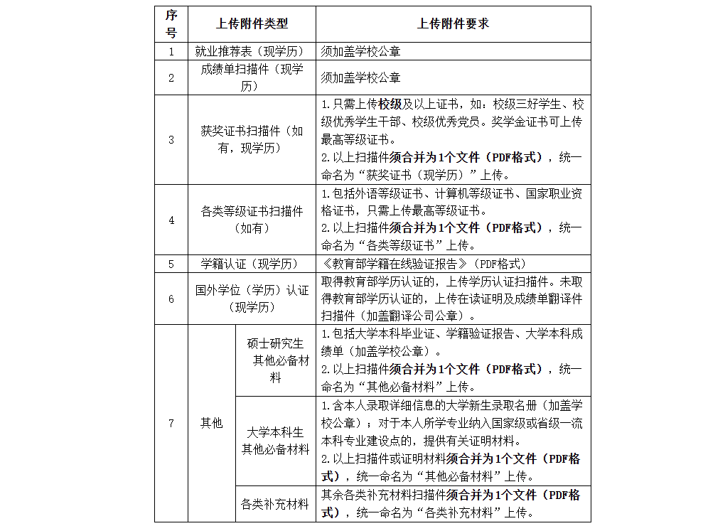 3.上传应聘附件材料。应聘毕业生须通过招聘平台及时、规范上传个人应聘附件材料,应聘附件材料文档数量一般不超过7个。未按要求上传必需材料且影响简历筛选判断或材料真实性存疑的,将影响简历筛选结果。上传附件具体要求如下: