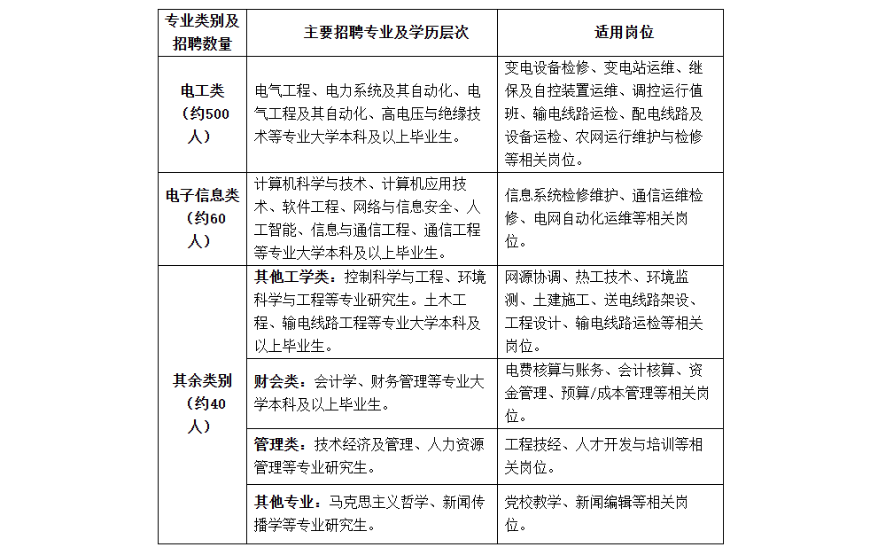 招聘专业类别为电工类、电子信息类、其他工学类、财会类、管理类及其他专业,招聘专业是指主修专业,不包含辅修专业。最终招聘数量将根据上级单位核定情况相应调整,第一批招聘数量(含提前批校园招聘数量)暂定如下: